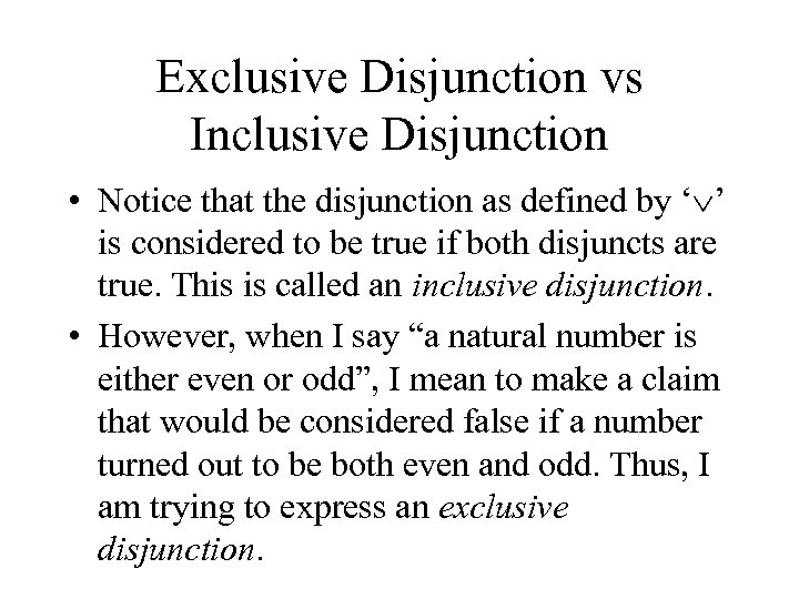 Exclusive Disjunction vs Inclusive Disjunction • Notice that the disjunction as defined by ‘ ’ is considered to be true if both disjuncts are true. This is called an inclusive disjunction. • However, when I say “a natural number is either even or odd”, I mean to make a claim that would be considered false if a number turned out to be both even and odd. Thus, I am trying to express an exclusive disjunction.