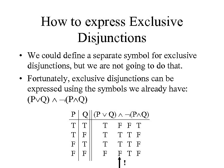 How to express Exclusive Disjunctions • We could define a separate symbol for exclusive disjunctions, but we are not going to do that. • Fortunately, exclusive disjunctions can be expressed using the symbols we already have: (P Q) P T T F F Q (P Q) (P Q) T T F F T T T F F T F !