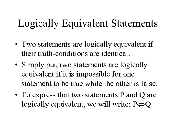 Logically Equivalent Statements • Two statements are logically equivalent if their truth-conditions are identical. • Simply put, two statements are logically equivalent if it is impossible for one statement to be true while the other is false. • To express that two statements P and Q are logically equivalent, we will write: P Q