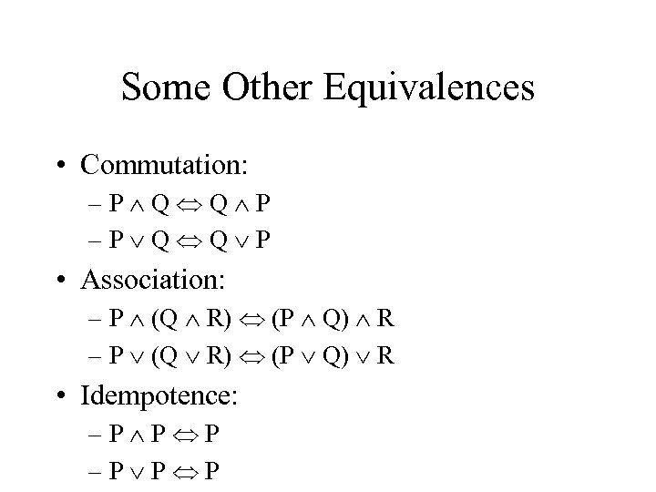 Some Other Equivalences • Commutation: –P Q Q P • Association: – P (Q R) (P Q) R • Idempotence: –P P P