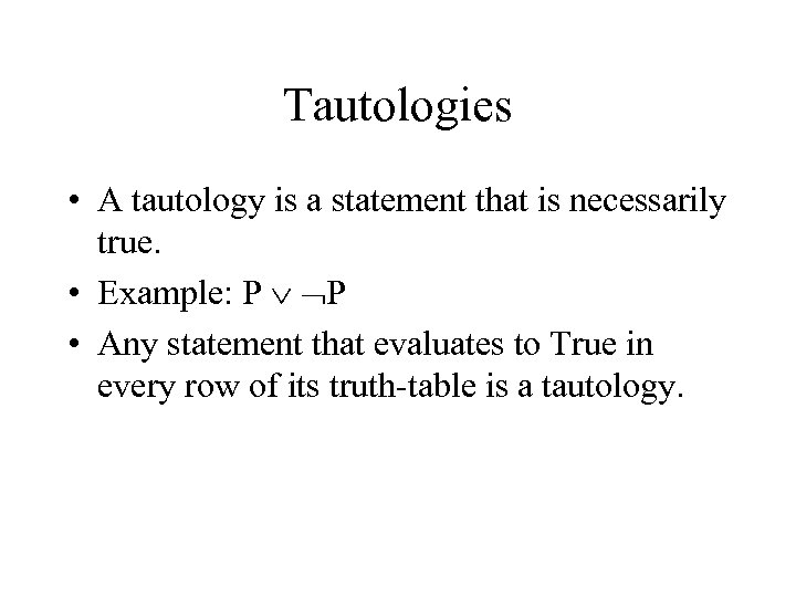 Tautologies • A tautology is a statement that is necessarily true. • Example: P P • Any statement that evaluates to True in every row of its truth-table is a tautology.