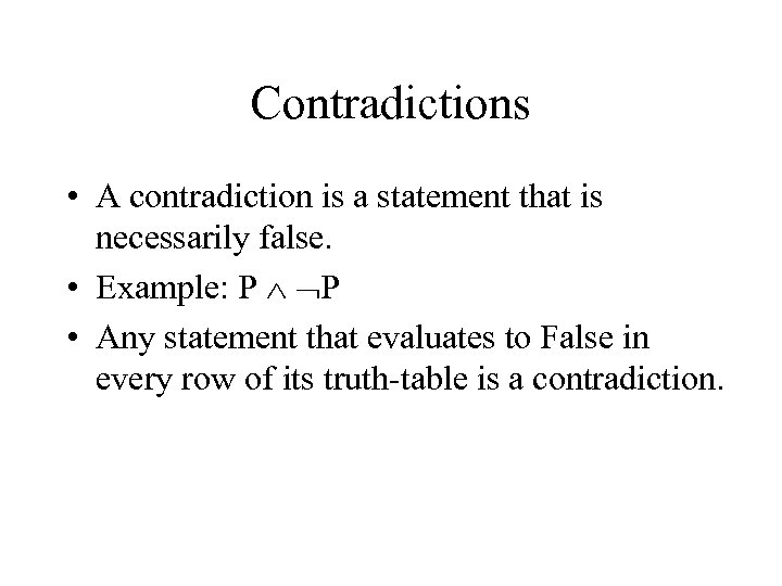 Contradictions • A contradiction is a statement that is necessarily false. • Example: P P • Any statement that evaluates to False in every row of its truth-table is a contradiction.