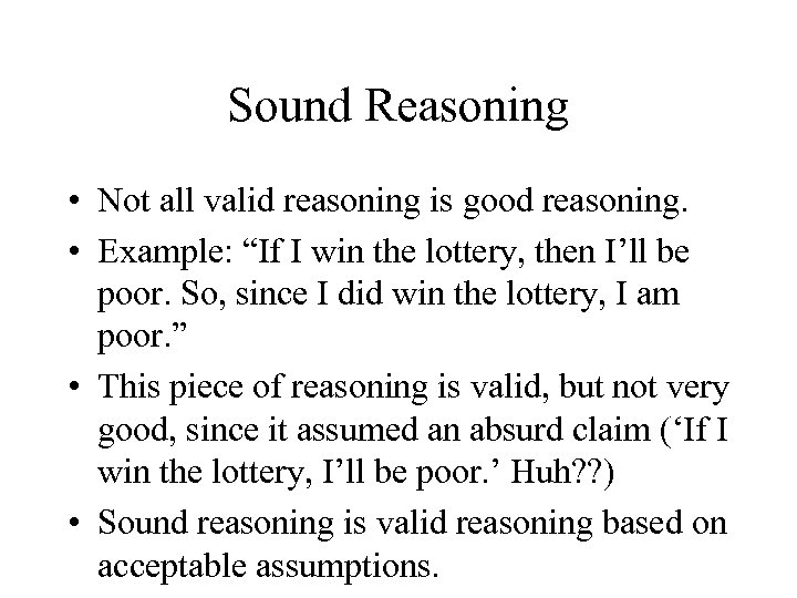 Sound Reasoning • Not all valid reasoning is good reasoning. • Example: “If I win the lottery, then I’ll be poor. So, since I did win the lottery, I am poor. ” • This piece of reasoning is valid, but not very good, since it assumed an absurd claim (‘If I win the lottery, I’ll be poor. ’ Huh? ? ) • Sound reasoning is valid reasoning based on acceptable assumptions.