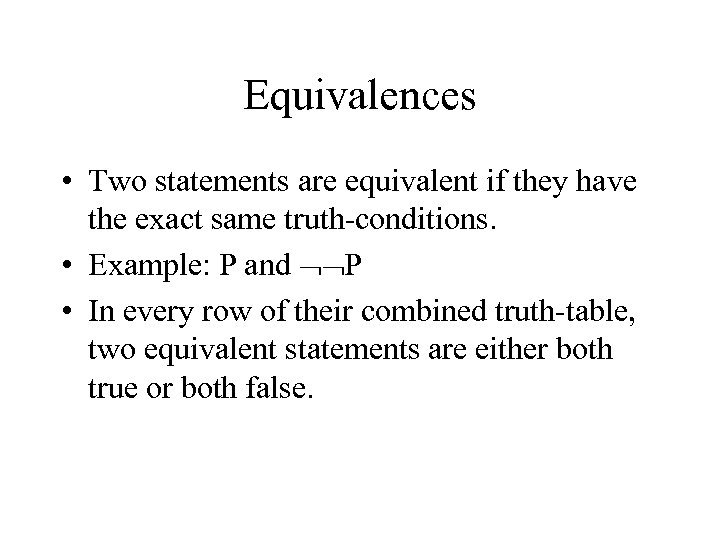 Equivalences • Two statements are equivalent if they have the exact same truth-conditions. • Example: P and P • In every row of their combined truth-table, two equivalent statements are either both true or both false.