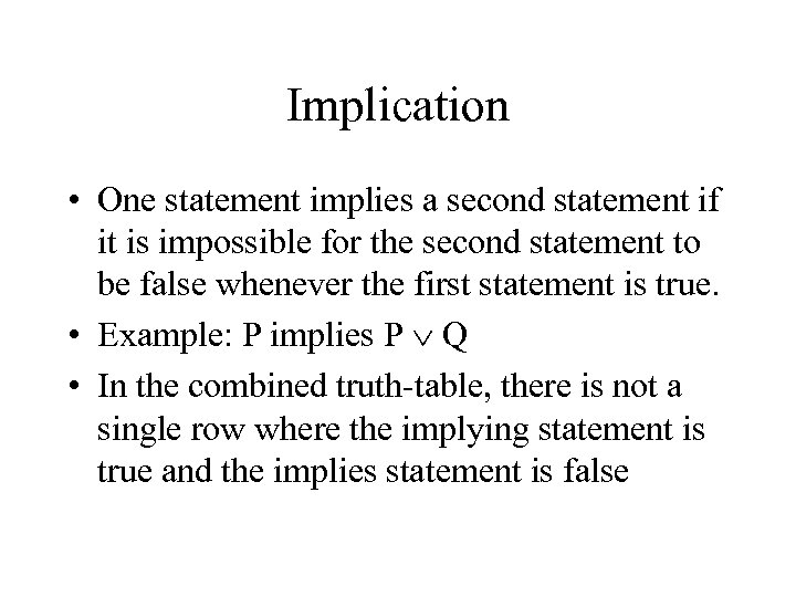 Implication • One statement implies a second statement if it is impossible for the second statement to be false whenever the first statement is true. • Example: P implies P Q • In the combined truth-table, there is not a single row where the implying statement is true and the implies statement is false
