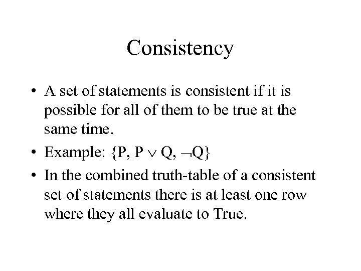 Consistency • A set of statements is consistent if it is possible for all of them to be true at the same time. • Example: {P, P Q, Q} • In the combined truth-table of a consistent set of statements there is at least one row where they all evaluate to True.
