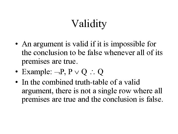 Validity • An argument is valid if it is impossible for the conclusion to be false whenever all of its premises are true. • Example: P, P Q Q • In the combined truth-table of a valid argument, there is not a single row where all premises are true and the conclusion is false.