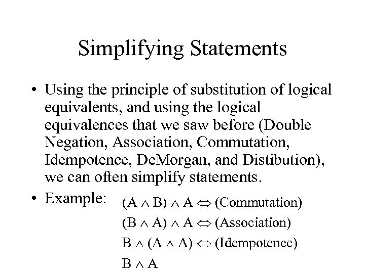 Simplifying Statements • Using the principle of substitution of logical equivalents, and using the logical equivalences that we saw before (Double Negation, Association, Commutation, Idempotence, De. Morgan, and Distibution), we can often simplify statements. • Example: (A B) A (Commutation) (B A) A (Association) B (A A) (Idempotence) B A