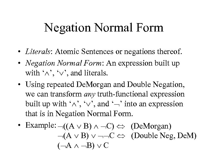 Negation Normal Form • Literals: Atomic Sentences or negations thereof. • Negation Normal Form: An expression built up with ‘ ’, and literals. • Using repeated De. Morgan and Double Negation, we can transform any truth-functional expression built up with ‘ ’, and ‘ ’ into an expression that is in Negation Normal Form. • Example: ((A B) C) (De. Morgan) (A B) C (Double Neg, De. M) ( A B) C