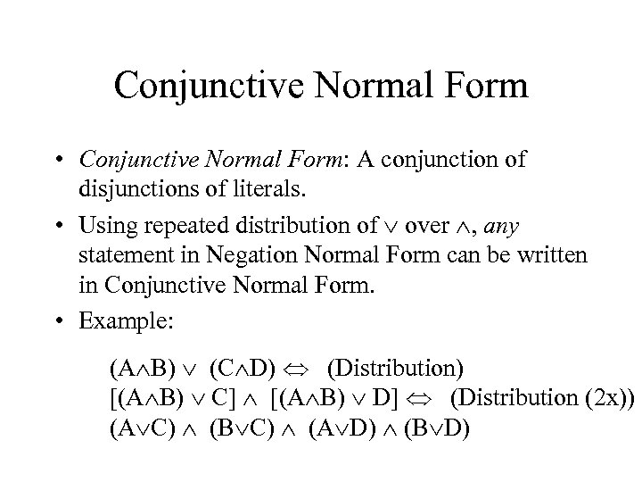 Conjunctive Normal Form • Conjunctive Normal Form: A conjunction of disjunctions of literals. • Using repeated distribution of over , any statement in Negation Normal Form can be written in Conjunctive Normal Form. • Example: (A B) (C D) (Distribution) [(A B) C] [(A B) D] (Distribution (2 x)) (A C) (B C) (A D) (B D)