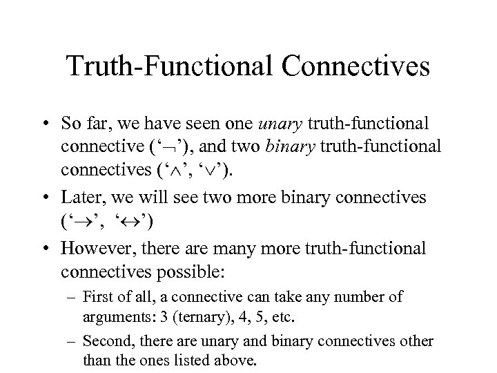 Truth-Functional Connectives • So far, we have seen one unary truth-functional connective (‘ ’), and two binary truth-functional connectives (‘ ’, ‘ ’). • Later, we will see two more binary connectives (‘ ’, ‘ ’) • However, there are many more truth-functional connectives possible: – First of all, a connective can take any number of arguments: 3 (ternary), 4, 5, etc. – Second, there are unary and binary connectives other than the ones listed above.