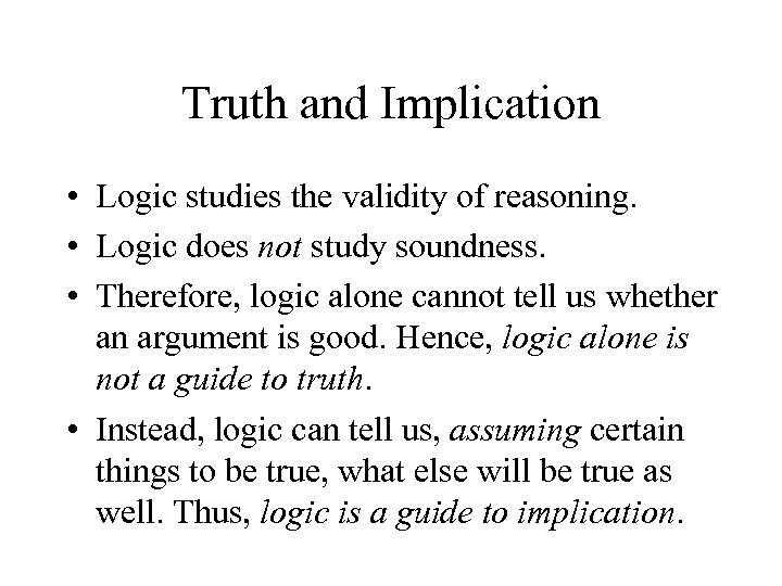 Truth and Implication • Logic studies the validity of reasoning. • Logic does not study soundness. • Therefore, logic alone cannot tell us whether an argument is good. Hence, logic alone is not a guide to truth. • Instead, logic can tell us, assuming certain things to be true, what else will be true as well. Thus, logic is a guide to implication.