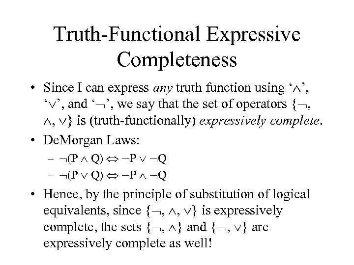 Truth-Functional Expressive Completeness • Since I can express any truth function using ‘ ’, and ‘ ’, we say that the set of operators { , , } is (truth-functionally) expressively complete. • De. Morgan Laws: – (P Q) P Q • Hence, by the principle of substitution of logical equivalents, since { , , } is expressively complete, the sets { , } and { , } are expressively complete as well!