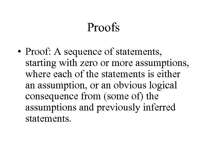 Proofs • Proof: A sequence of statements, starting with zero or more assumptions, where each of the statements is either an assumption, or an obvious logical consequence from (some of) the assumptions and previously inferred statements.