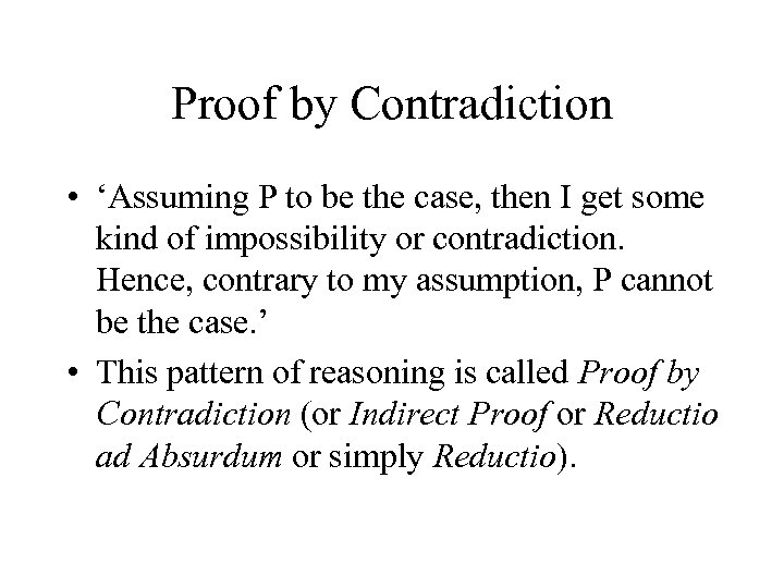 Proof by Contradiction • ‘Assuming P to be the case, then I get some kind of impossibility or contradiction. Hence, contrary to my assumption, P cannot be the case. ’ • This pattern of reasoning is called Proof by Contradiction (or Indirect Proof or Reductio ad Absurdum or simply Reductio).