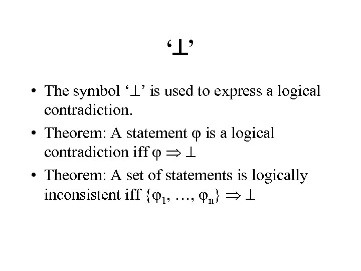 ‘ ’ • The symbol ‘ ’ is used to express a logical contradiction. • Theorem: A statement is a logical contradiction iff • Theorem: A set of statements is logically inconsistent iff { 1, …, n}