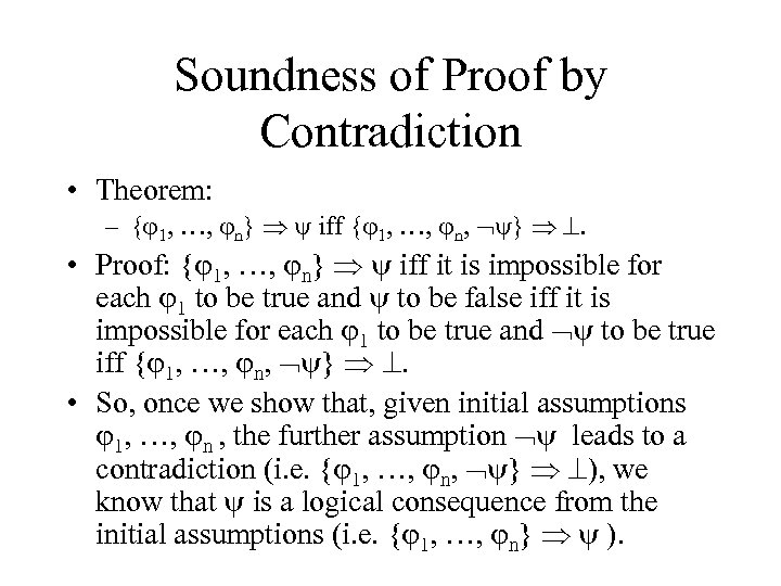 Soundness of Proof by Contradiction • Theorem: – { 1, …, n} iff { 1, …, n, } . • Proof: { 1, …, n} iff it is impossible for each 1 to be true and to be false iff it is impossible for each 1 to be true and to be true iff { 1, …, n, } . • So, once we show that, given initial assumptions 1, …, n , the further assumption leads to a contradiction (i. e. { 1, …, n, } ), we know that is a logical consequence from the initial assumptions (i. e. { 1, …, n} ).