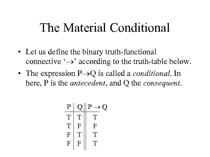 The Material Conditional • Let us define the binary truth-functional connective ‘ ’ according to the truth-table below. • The expression P Q is called a conditional. In here, P is the antecedent, and Q the consequent. P T T F F Q P Q T T F F T T F T