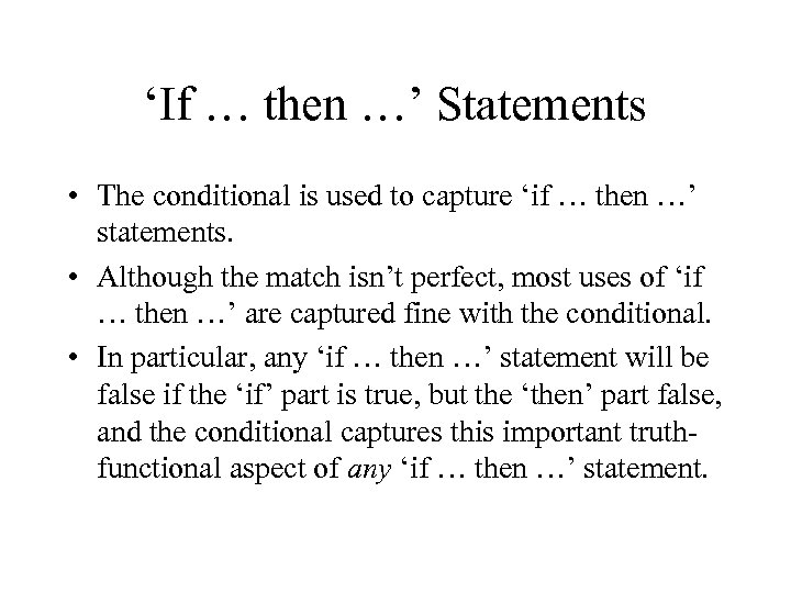 ‘If … then …’ Statements • The conditional is used to capture ‘if … then …’ statements. • Although the match isn’t perfect, most uses of ‘if … then …’ are captured fine with the conditional. • In particular, any ‘if … then …’ statement will be false if the ‘if’ part is true, but the ‘then’ part false, and the conditional captures this important truthfunctional aspect of any ‘if … then …’ statement.