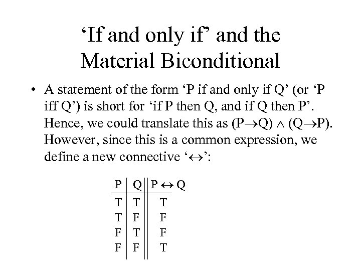 ‘If and only if’ and the Material Biconditional • A statement of the form ‘P if and only if Q’ (or ‘P iff Q’) is short for ‘if P then Q, and if Q then P’. Hence, we could translate this as (P Q) (Q P). However, since this is a common expression, we define a new connective ‘ ’: P T T F F Q P Q T T F F T