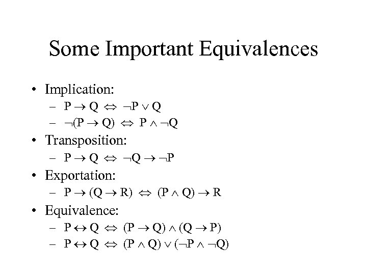 Some Important Equivalences • Implication: – P Q – (P Q) P Q • Transposition: – P Q Q P • Exportation: – P (Q R) (P Q) R • Equivalence: – P Q (P Q) (Q P) – P Q (P Q) ( P Q)
