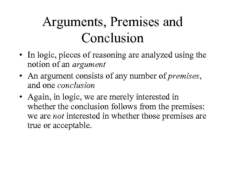 Arguments, Premises and Conclusion • In logic, pieces of reasoning are analyzed using the notion of an argument • An argument consists of any number of premises, and one conclusion • Again, in logic, we are merely interested in whether the conclusion follows from the premises: we are not interested in whether those premises are true or acceptable.