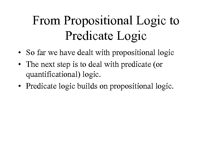 From Propositional Logic to Predicate Logic • So far we have dealt with propositional logic • The next step is to deal with predicate (or quantificational) logic. • Predicate logic builds on propositional logic.