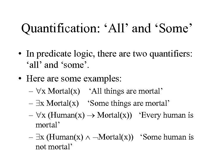 Quantification: ‘All’ and ‘Some’ • In predicate logic, there are two quantifiers: ‘all’ and ‘some’. • Here are some examples: – x Mortal(x) ‘All things are mortal’ – x Mortal(x) ‘Some things are mortal’ – x (Human(x) Mortal(x)) ‘Every human is mortal’ – x (Human(x) Mortal(x)) ‘Some human is not mortal’
