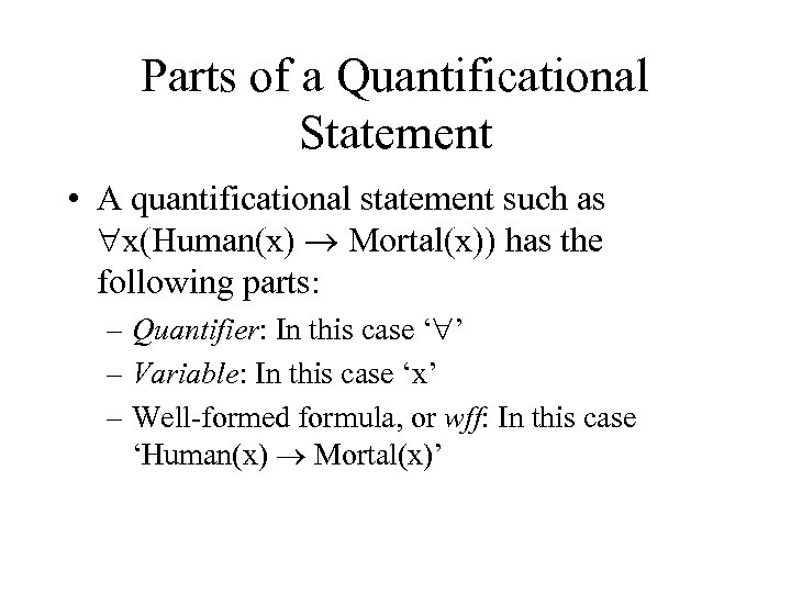 Parts of a Quantificational Statement • A quantificational statement such as x(Human(x) Mortal(x)) has the following parts: – Quantifier: In this case ‘ ’ – Variable: In this case ‘x’ – Well-formed formula, or wff: In this case ‘Human(x) Mortal(x)’