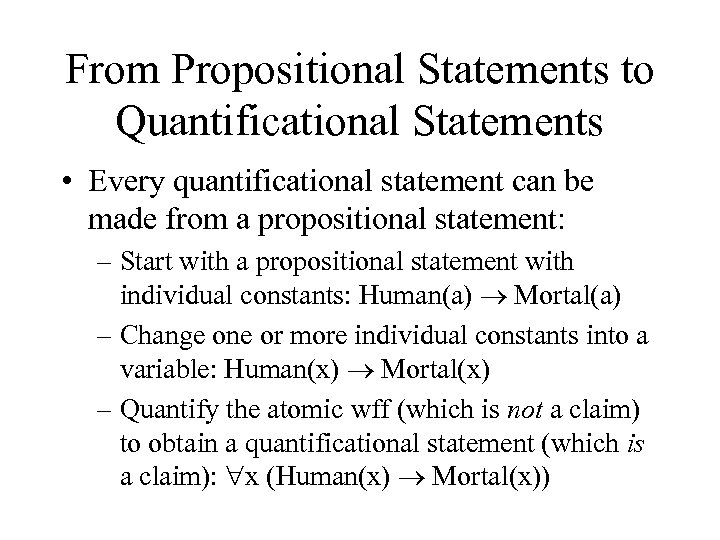 From Propositional Statements to Quantificational Statements • Every quantificational statement can be made from a propositional statement: – Start with a propositional statement with individual constants: Human(a) Mortal(a) – Change one or more individual constants into a variable: Human(x) Mortal(x) – Quantify the atomic wff (which is not a claim) to obtain a quantificational statement (which is a claim): x (Human(x) Mortal(x))