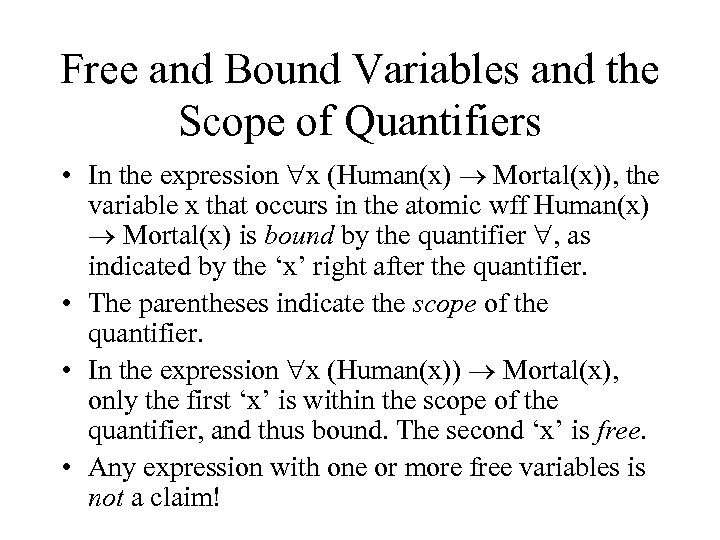 Free and Bound Variables and the Scope of Quantifiers • In the expression x (Human(x) Mortal(x)), the variable x that occurs in the atomic wff Human(x) Mortal(x) is bound by the quantifier , as indicated by the ‘x’ right after the quantifier. • The parentheses indicate the scope of the quantifier. • In the expression x (Human(x)) Mortal(x), only the first ‘x’ is within the scope of the quantifier, and thus bound. The second ‘x’ is free. • Any expression with one or more free variables is not a claim!