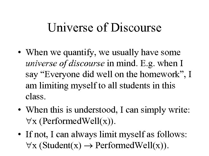 Universe of Discourse • When we quantify, we usually have some universe of discourse in mind. E. g. when I say “Everyone did well on the homework”, I am limiting myself to all students in this class. • When this is understood, I can simply write: x (Performed. Well(x)). • If not, I can always limit myself as follows: x (Student(x) Performed. Well(x)).