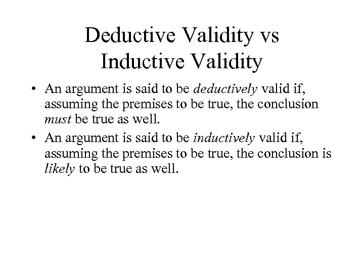 Deductive Validity vs Inductive Validity • An argument is said to be deductively valid if, assuming the premises to be true, the conclusion must be true as well. • An argument is said to be inductively valid if, assuming the premises to be true, the conclusion is likely to be true as well.