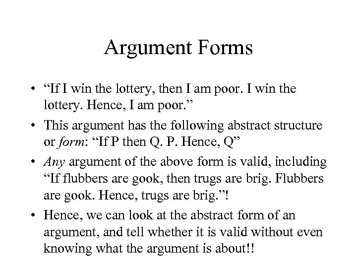 Argument Forms • “If I win the lottery, then I am poor. I win the lottery. Hence, I am poor. ” • This argument has the following abstract structure or form: “If P then Q. P. Hence, Q” • Any argument of the above form is valid, including “If flubbers are gook, then trugs are brig. Flubbers are gook. Hence, trugs are brig. ”! • Hence, we can look at the abstract form of an argument, and tell whether it is valid without even knowing what the argument is about!!