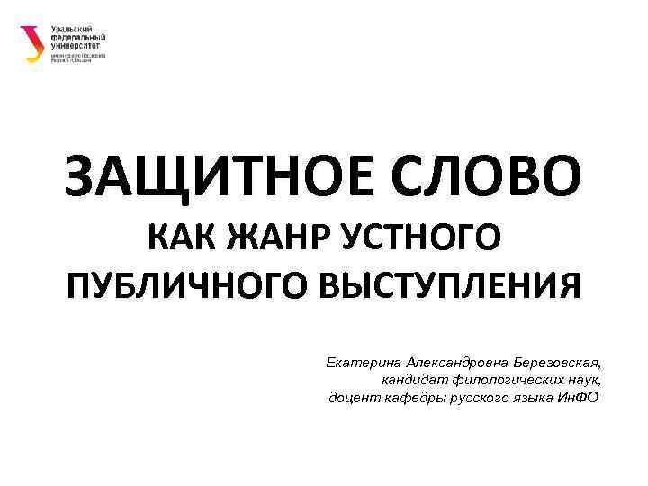 ЗАЩИТНОЕ СЛОВО КАК ЖАНР УСТНОГО ПУБЛИЧНОГО ВЫСТУПЛЕНИЯ Екатерина Александровна Березовская, кандидат филологических наук, доцент кафедры русского языка Ин. ФО