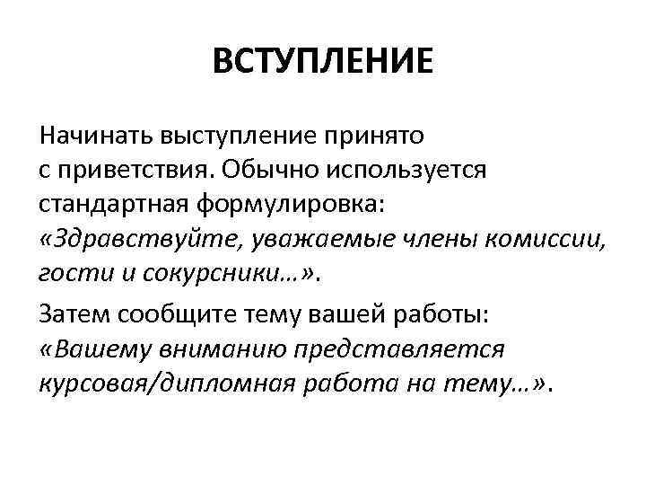 ВСТУПЛЕНИЕ Начинать выступление принято с приветствия. Обычно используется стандартная формулировка: «Здравствуйте, уважаемые члены комиссии, гости и сокурсники…» . Затем сообщите тему вашей работы: «Вашему вниманию представляется курсовая/дипломная работа на тему…» .