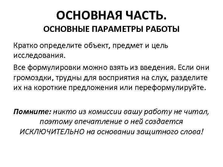 ОСНОВНАЯ ЧАСТЬ. ОСНОВНЫЕ ПАРАМЕТРЫ РАБОТЫ Кратко определите объект, предмет и цель исследования. Все формулировки можно взять из введения. Если они громоздки, трудны для восприятия на слух, разделите их на короткие предложения или переформулируйте. Помните: никто из комиссии вашу работу не читал, поэтому впечатление о ней создается ИСКЛЮЧИТЕЛЬНО на основании защитного слова!