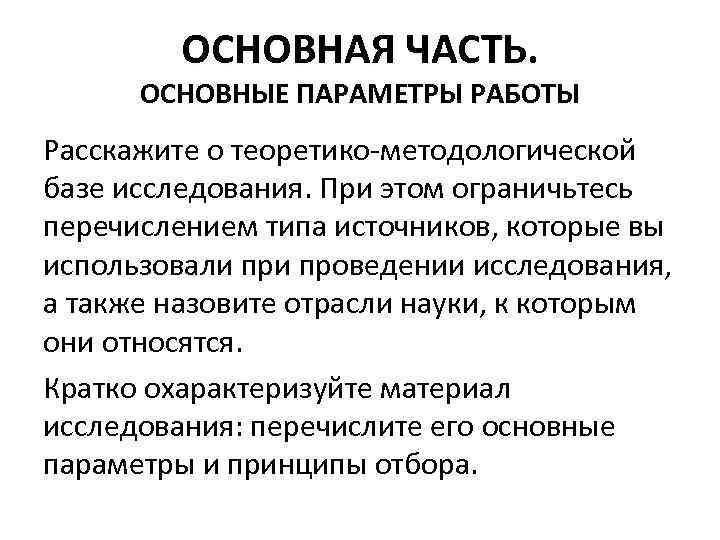 ОСНОВНАЯ ЧАСТЬ. ОСНОВНЫЕ ПАРАМЕТРЫ РАБОТЫ Расскажите о теоретико-методологической базе исследования. При этом ограничьтесь перечислением типа источников, которые вы использовали проведении исследования, а также назовите отрасли науки, к которым они относятся. Кратко охарактеризуйте материал исследования: перечислите его основные параметры и принципы отбора.