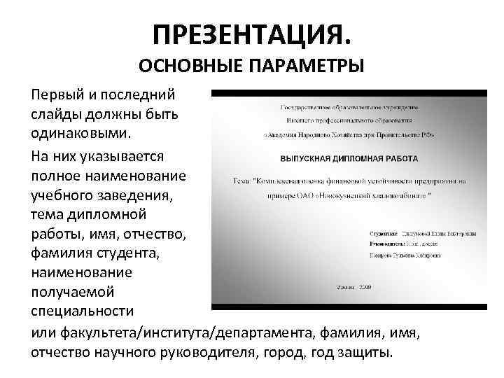 ПРЕЗЕНТАЦИЯ. ОСНОВНЫЕ ПАРАМЕТРЫ Первый и последний слайды должны быть одинаковыми. На них указывается полное наименование учебного заведения, тема дипломной работы, имя, отчество, фамилия студента, наименование получаемой специальности или факультета/института/департамента, фамилия, имя, отчество научного руководителя, город, год защиты.
