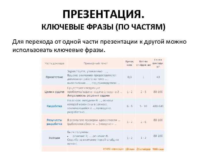 ПРЕЗЕНТАЦИЯ. КЛЮЧЕВЫЕ ФРАЗЫ (ПО ЧАСТЯМ) Для перехода от одной части презентации к другой можно использовать ключевые фразы.