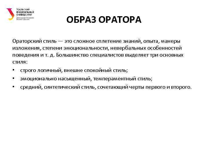 ОБРАЗ ОРАТОРА Ораторский стиль — это сложное сплетение знаний, опыта, манеры изложения, степени эмоциональности, невербальных особенностей поведения и т. д. Большинство специалистов выделяет три основных стиля: • строго логичный, внешне спокойный стиль; • эмоционально насыщенный, темпераментный стиль; • средний, синтетический стиль, сочетающий черты первого и второго.