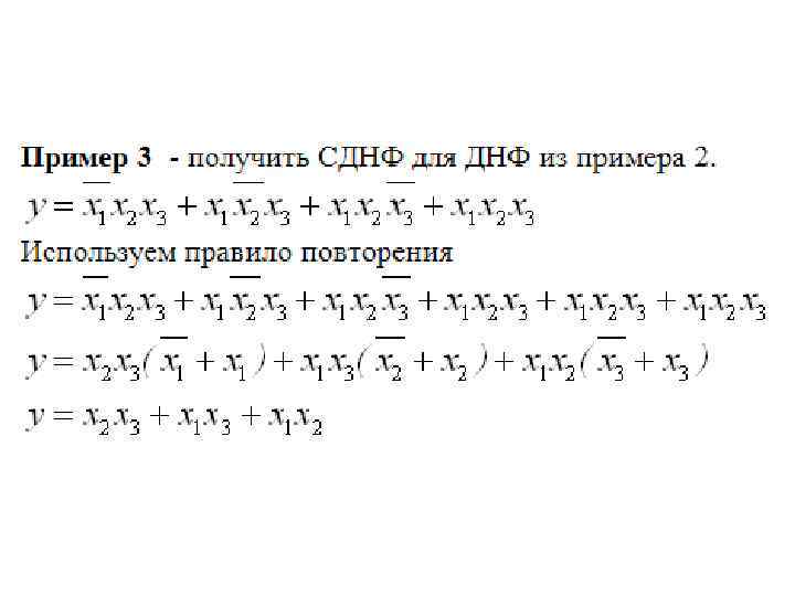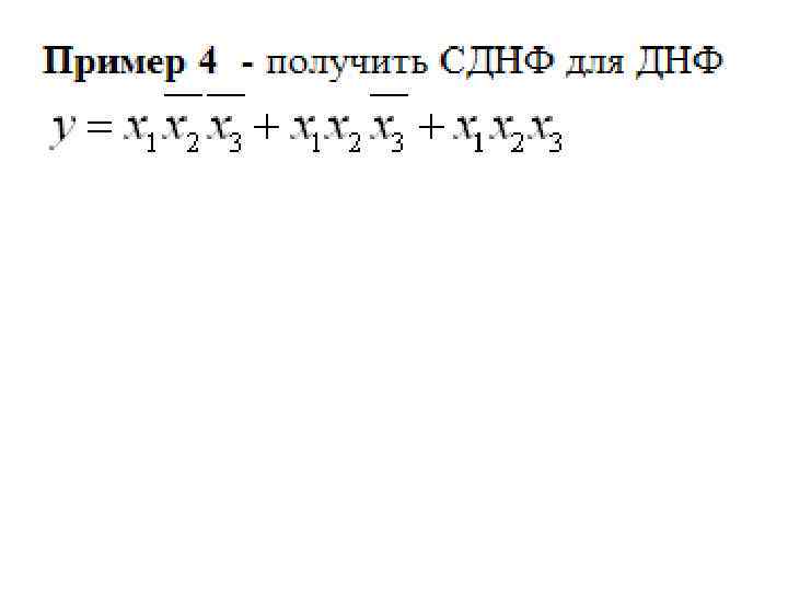 Аналитический способ задания булевой функции • дизьюнктивная нормальная форма (ДНФ) Дизъюнкти вная норма льная фо рма (ДНФ) в булевой логике — нормальная форма, в которой булева формула имеет вид дизъюнкции конъюнкций литералов. • совершенная дизьюнктивная нормальная форма (СДНФ) СДНФ это такая ДНФ, которая удовлетворяет трём условиям: - в ней нет одинаковых элементарных конъюнкций; - в каждой конъюнкции нет одинаковых пропозициональных букв; - каждая элементарная конъюнкция содержит каждую пропозициональную букву из входящих в данную ДНФ пропозициональных букв, причем в одинаковом порядке. Для любой функции алгебры логики существует своя СДНФ, причем единственная.