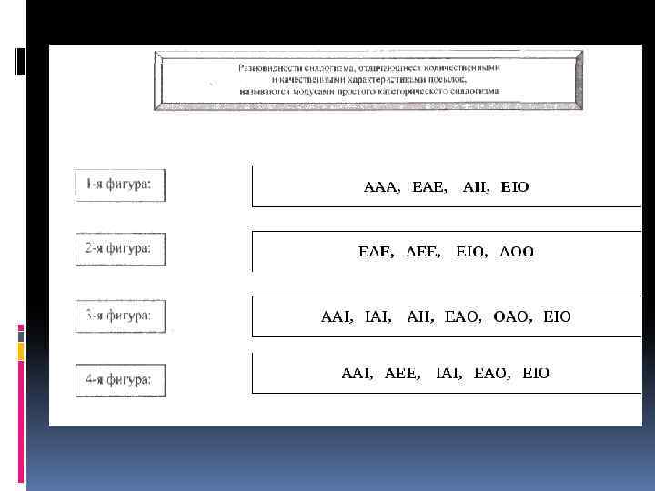 Названия/имена модусов Фигура 1 Фигура 2 Фигура 3 Фигура 4 Barbara Cesare Darapti Bramantip Celarent Camestres Disamis Camenes Darii Festino Datisi Dimaris Ferio Baroco Felapton Fesapo Bocardo Fresison Ferison
