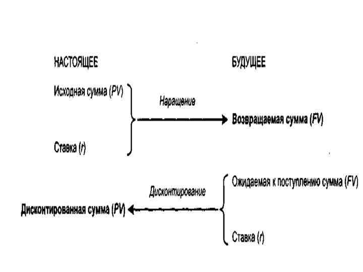 Процесс, в котором заданы ожидаемая в будущем к получению (возвращаемая) сумма и ставка, называется дисконтированием, искомая величина – дисконтированной суммой (иногда используется термин приведенная сумма ), а используемая в операции ставка – ставка дисконтирования.