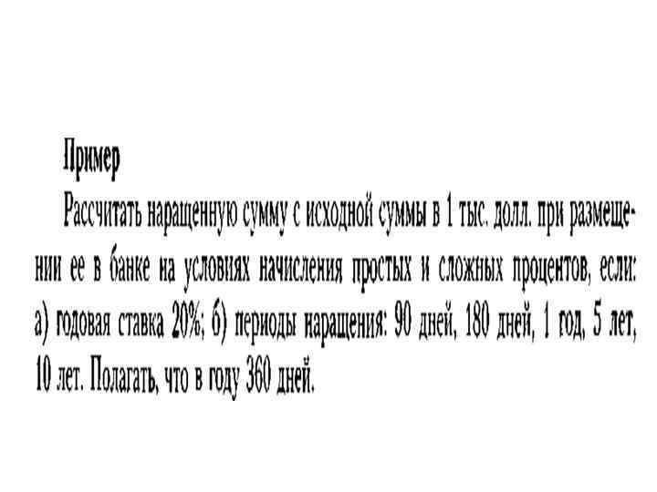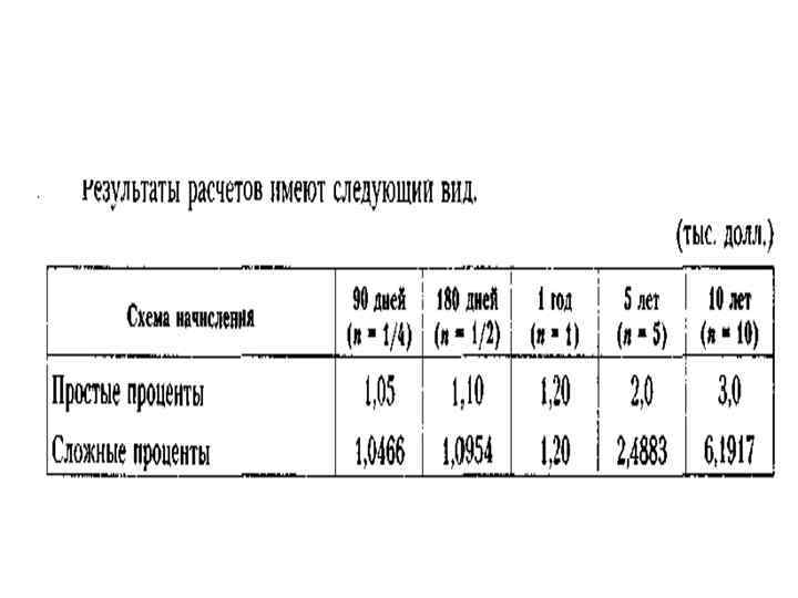 Таким образом, если денежные средства размещены в банке на срок 90 дней (менее одного года), то наращенная сумма составит: • при использовании схемы простых процентов – 1, 05 тыс. долл. ; • при использовании схемы сложных процентов - 1, 0466 тыс. долл.