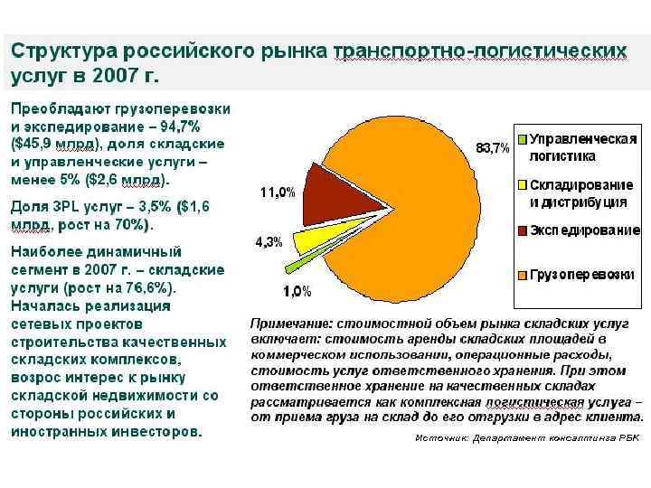 Рынок логистического аутсорсинга в РФ присутствие 3 -х групп отечественных логистических посредников: 1 PL, 2 PL и 3 PL провайдеров. спрос на аутсорсинг отдельных логистических операций (хранение, транспортировка, дистрибуция, т. п. ). объем логистического рынка - 32 млрд. долл. потенциал логистического рынка-150 млрд. долл. доля логистического аутсорсинга- до 4%. темпы роста логистического аутсорсинга - до 30% в год.
