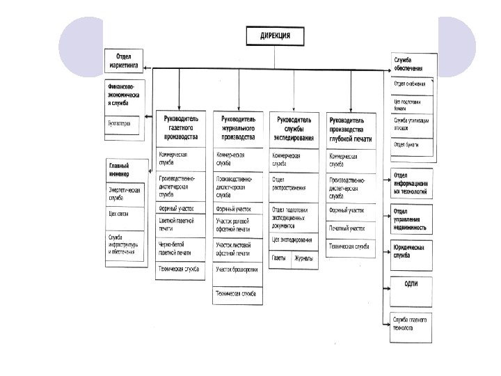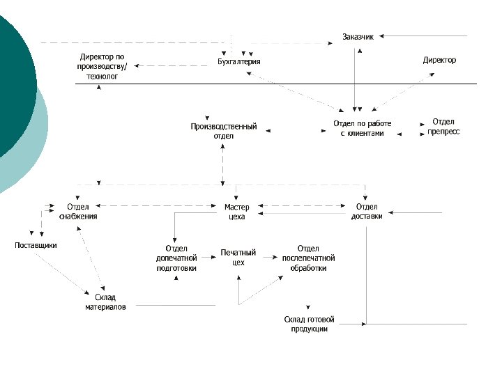 Схема логистической системы в двух вариантах толкающего и тянущего типа Типография Главный технолог Главный бухгалтер Производс твенный отдел Основные цеха Сектор печатных процессов Сектор послепечат ных процессов Ремонтно – механическ ий участок ОТК Менедж ер по работе с клиента ми Бухгалтерия Группа техникоэкономического планирования Отдел сбыта Склад готовой продукции Упаковка Покупатель Поставщик Сектор допечатных процессов Вспомога тельные цеха Энергоцех Экспед иции Планово – экономически й отдел Касса Отдел материально – технического снабжения Склад БАНК Директор