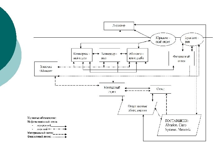 Отдел компьютерной обработки информации Конкурент Розничный отдел Отдел закупок: Коммерческий отдел Отдел поставок Поставщик Отдел заказов Склад ы: № 1 Розничный покупатель Транспортн ый отдел № 2 № 3 № 4 Отдел продаж: Отдел образцов Менеджеры торгового зала Региональные менеджеры Менеджеры по поиску кл -тов Директо р образцо Служба в персона ла Бухгалтер ия Юриди ч. отдел Отдел рекламы и маркетинга Оптовый покупатель
