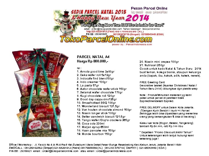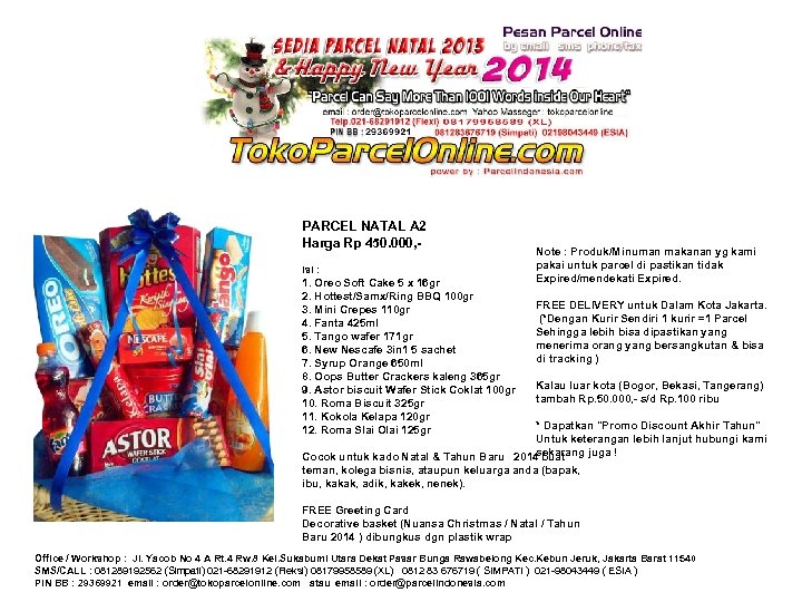 PARCEL NATAL A 4 Harga Rp 800. 000, Isi : 1. Arnots good time 3 x 80 gr 2. Deka wafer roll 5 x 12 gr 3. Indocafe find blend 50 gr 4. Indo creamer 100 gr 5. La pasta 57 gr 6. Astor chocolate wafer stick 150 gr 7. Selamat wafer chocolate 170 gr 8. Kugi chocolate roll 120 gr 9. Good day cappucino 125 gr 10. Smax/hottest BBQ 100 gr 11. Wonderland biscuit 121, 5 gr 12. Van houten chocolate almond 150 gr 13. Nissin longer stick 100 gr 14. Better sandwich biscuit 121, 5 gr 15. Tango wafer /Oop’s crackers 365 gr 16. Coca cola 330 ml 17. Marjan syrup 650 ml 18. Haan pancake mix 150 gr 19. Monde bourbon 150 gr 20. Nissin mini crepes 100 gr 21. Nutrisari 250 gr Cocok untuk kado Natal & Tahun Baru 2014 buat teman, kolega bisnis, ataupun keluarga anda (bapak, ibu, kakak, adik, kakek, nenek). FREE Greeting Card Decorative basket (Nuansa Christmas / Natal / Tahun Baru 2014 ) dibungkus dgn plastik wrap Note : Produk/Minuman makanan yg kami pakai untuk parcel di pastikan tidak Expired/mendekati Expired. FREE DELIVERY untuk Dalam Kota Jakarta. (*Dengan Kurir Sendiri 1 kurir =1 Parcel Sehingga lebih bisa dipastikan yang menerima orang yang bersangkutan & bisa di tracking ) Kalau luar kota (Bogor, Bekasi, Tangerang) tambah Rp. 50. 000, - s/d Rp. 100 ribu * Dapatkan "Promo Discount Akhir Tahun" Untuk keterangan lebih lanjut hubungi kami sekarang juga ! Office / Workshop : Jl. Yacob No 4 A Rt. 4 Rw. 8 Kel. Sukabumi Utara Dekat Pasar Bunga Rawabelong Kec. Kebun Jeruk, Jakarta Barat 11540 SMS/CALL : 081289192562 (Simpati) 021 -68291912 (Fleksi) 08179958589 (XL) 0812 83 676719 ( SIMPATI ) 021 -98043449 ( ESIA ) PIN BB : 29369921 email : order@tokoparcelonline. com atau email : order@parcelindonesia. com