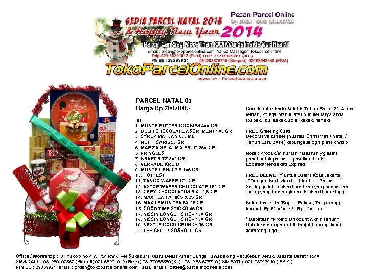 PARCEL NATAL 05 Harga Rp 700. 000, Isi : 1. MONDE BUTTER COOKIES 400 GR 2. DELFI CHOCOLATE ASORTMENT 100 GR 3. SYRUP MARJAN 600 ML 4. NUTRI SARI 250 GR 5. MARIZA SELAI MIX FRUIT 250 GR 6. PRINGLES 7. KRAFT RITZ 300 GR 8. VERKADE KRUID 9. MONDE GENJI PIE 105 GR 10. HOTTEST 11. TANGO WAFER 171 GR 12. ASTOR WAFER CHOCOLATE 150 GR 13. GERY CHOCOLATOS 8 X 12, 5 GR 14. MAX TEA TARIK 5 X 25 GR 15. MAX LEMON TEA 5 X 25 GR 16. GOOD TIME STICKO 45 GR 17. NISSIN LONGER STICK 100 GR 18. NISSIN LONGER STICK 100 GR 19. NESTLE COCO CRUNCH 35 GR 20. TEH CELUP SOSRO 30 GR Cocok untuk kado Natal & Tahun Baru 2014 buat teman, kolega bisnis, ataupun keluarga anda (bapak, ibu, kakak, adik, kakek, nenek). FREE Greeting Card Decorative basket (Nuansa Christmas / Natal / Tahun Baru 2014 ) dibungkus dgn plastik wrap Note : Produk/Minuman makanan yg kami pakai untuk parcel di pastikan tidak Expired/mendekati Expired. FREE DELIVERY untuk Dalam Kota Jakarta. (*Dengan Kurir Sendiri 1 kurir =1 Parcel Sehingga lebih bisa dipastikan yang menerima orang yang bersangkutan & bisa di tracking ) Kalau luar kota (Bogor, Bekasi, Tangerang) tambah Rp. 50. 000, - s/d Rp. 100 ribu * Dapatkan "Promo Discount Akhir Tahun" Untuk keterangan lebih lanjut hubungi kami sekarang juga ! Office / Workshop : Jl. Yacob No 4 A Rt. 4 Rw. 8 Kel. Sukabumi Utara Dekat Pasar Bunga Rawabelong Kec. Kebun Jeruk, Jakarta Barat 11540 SMS/CALL : 081289192562 (Simpati) 021 -68291912 (Fleksi) 08179958589 (XL) 0812 83 676719 ( SIMPATI ) 021 -98043449 ( ESIA ) PIN BB : 29369921 email : order@tokoparcelonline. com atau email : order@parcelindonesia. com